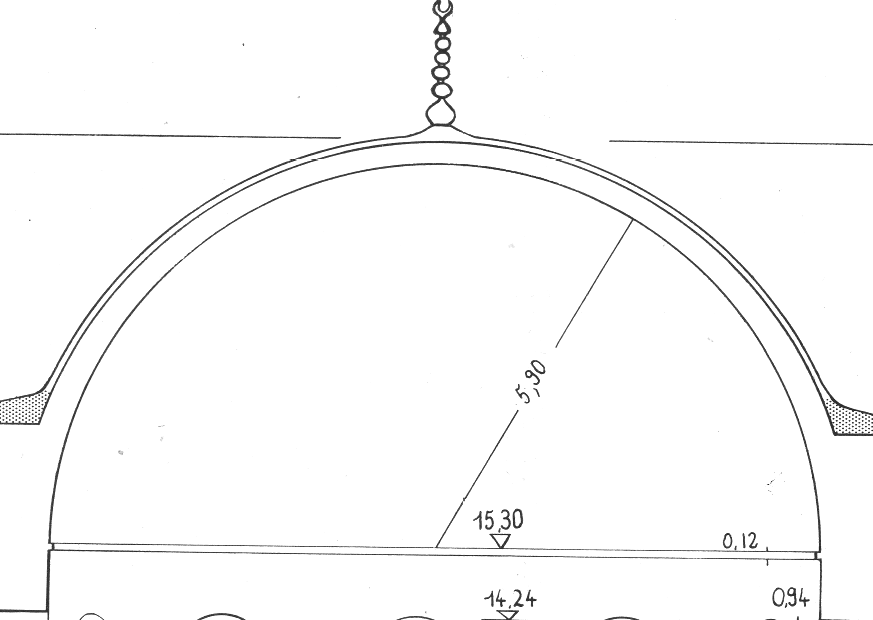 Certains plans donnent la mesure maximale pour le dôme à 31.4 mètres, d'autres 31.25 mètres, par contre des minimales assez semblables, autour de 30.80 mètres.