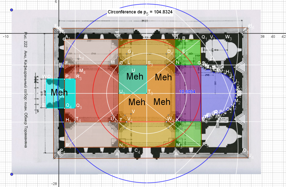 Ce cercle bleu s'inscrit dans un carré de quatre Meh de surface, c'est le transept qui d'ailleurs s'inscrit dans un cercle ici visualisé qui n'est autre que le socle de la Tholos de Delphes