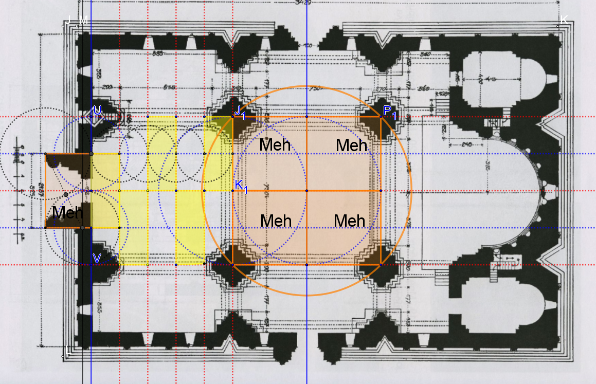 Ce cercle bleu s'inscrit dans un carré de quatre Meh de surface, c'est le transept qui d'ailleurs s'inscrit dans un cercle ici visualisé qui n'est autre que le socle de la Tholos de Delphes