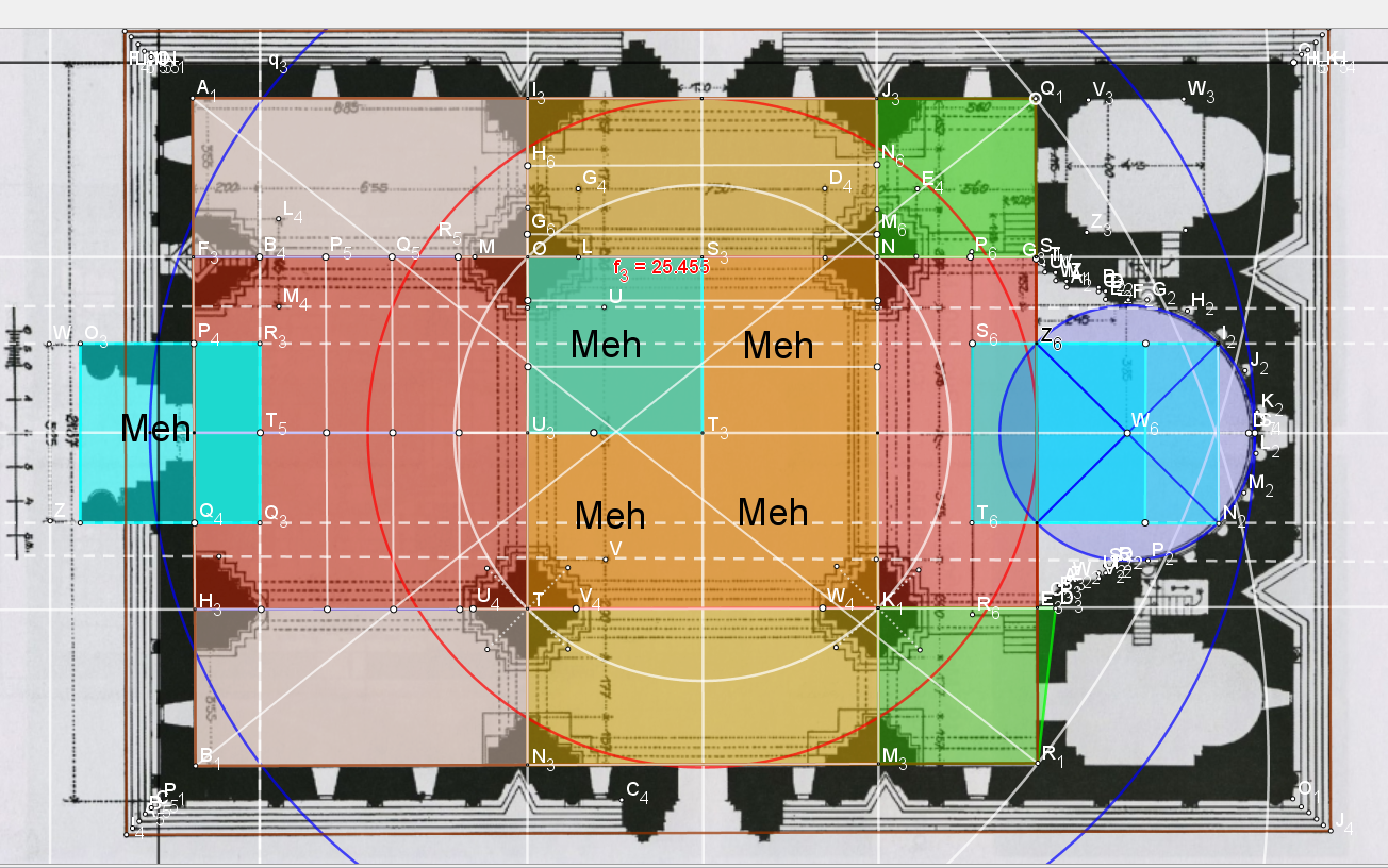 En bleu, le grand cercle determine donc la largeur de l'édifice, il a pour diamètre la distance donnée par 20 modules surface !
