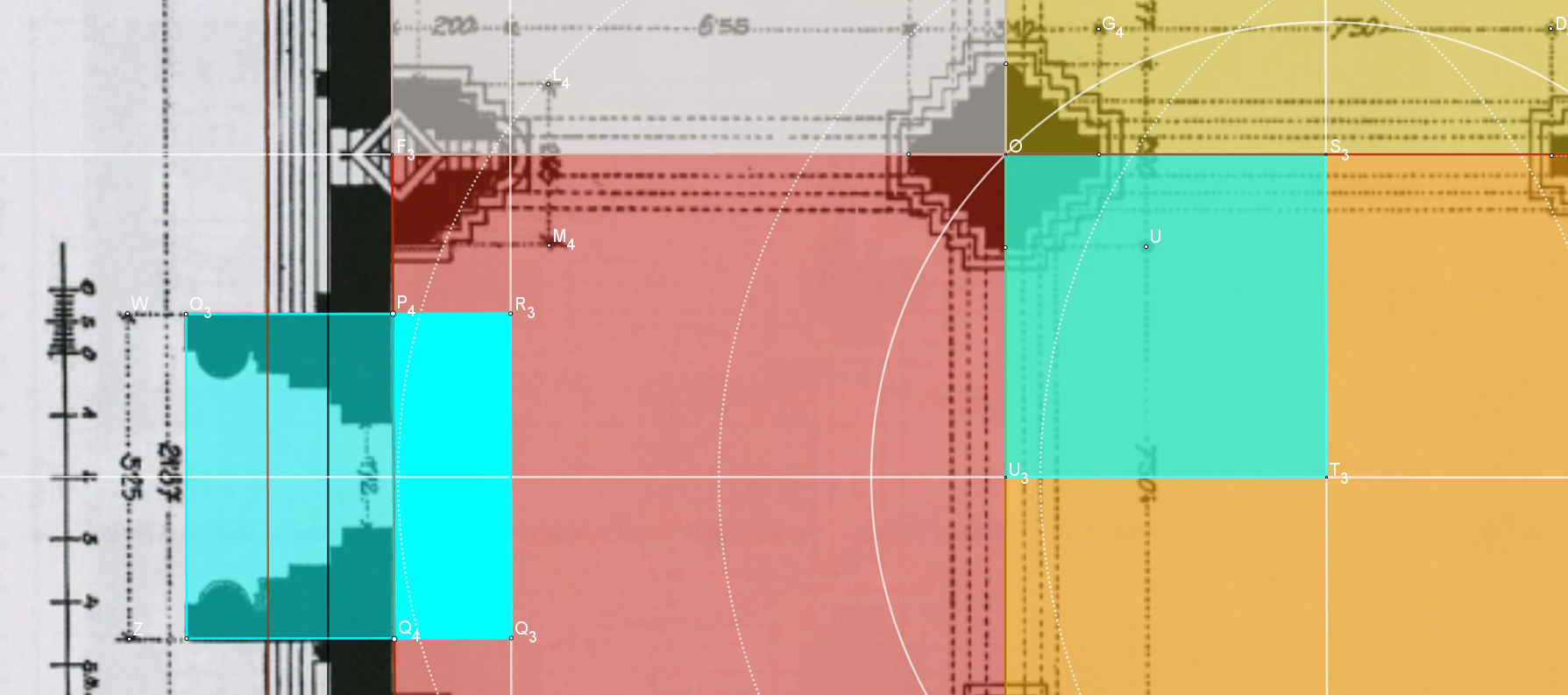 En bleu, le grand cercle determine donc la largeur de l'édifice, il a pour diamètre la distance donnée par 20 modules surface !