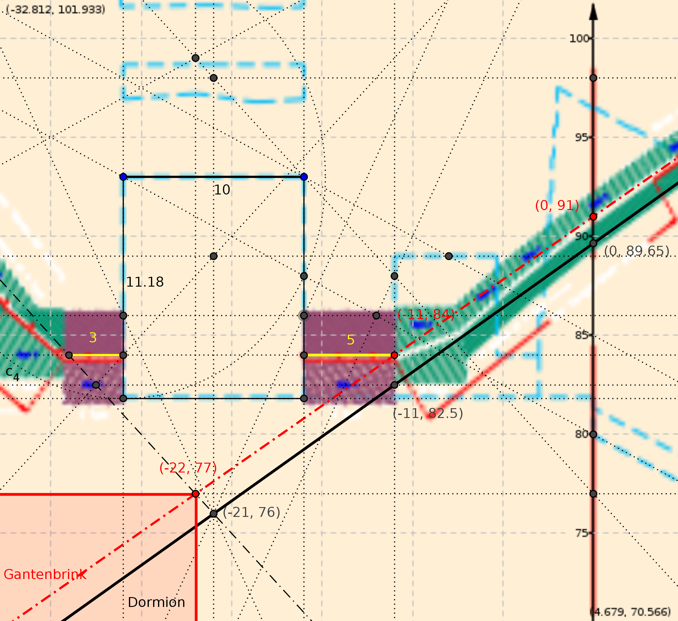 - Tout le monde semble d'accord pour une portion de conduit horizontale à partir du mur Nord de la chambre; ce qui nous donne un point de départ de pente parfaitement défini en abscisse et ordonnée; tout le monde semble (à peu près) d'accord pour un point de sortie parfaitement défini en abscisse et ordonnées; à partir de ces deux points il me parait élémentaire de connaître la pente de ce conduit telle que l'a voulu l'architecte.