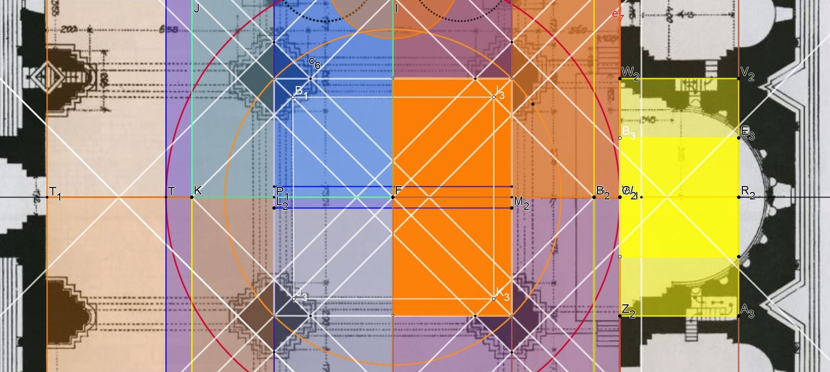 Ce grand cercle d' 1 Clima surface touche 3 côtés de ce rectangle et son centre détermine le centre de la croisée du transept