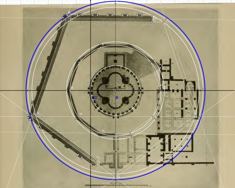 Ce cercle de même aire détermine la largeur intérieure, le rectangle intérieur et aussi l'emplacement du centre du transept, cercle qui lui reste presque visible!