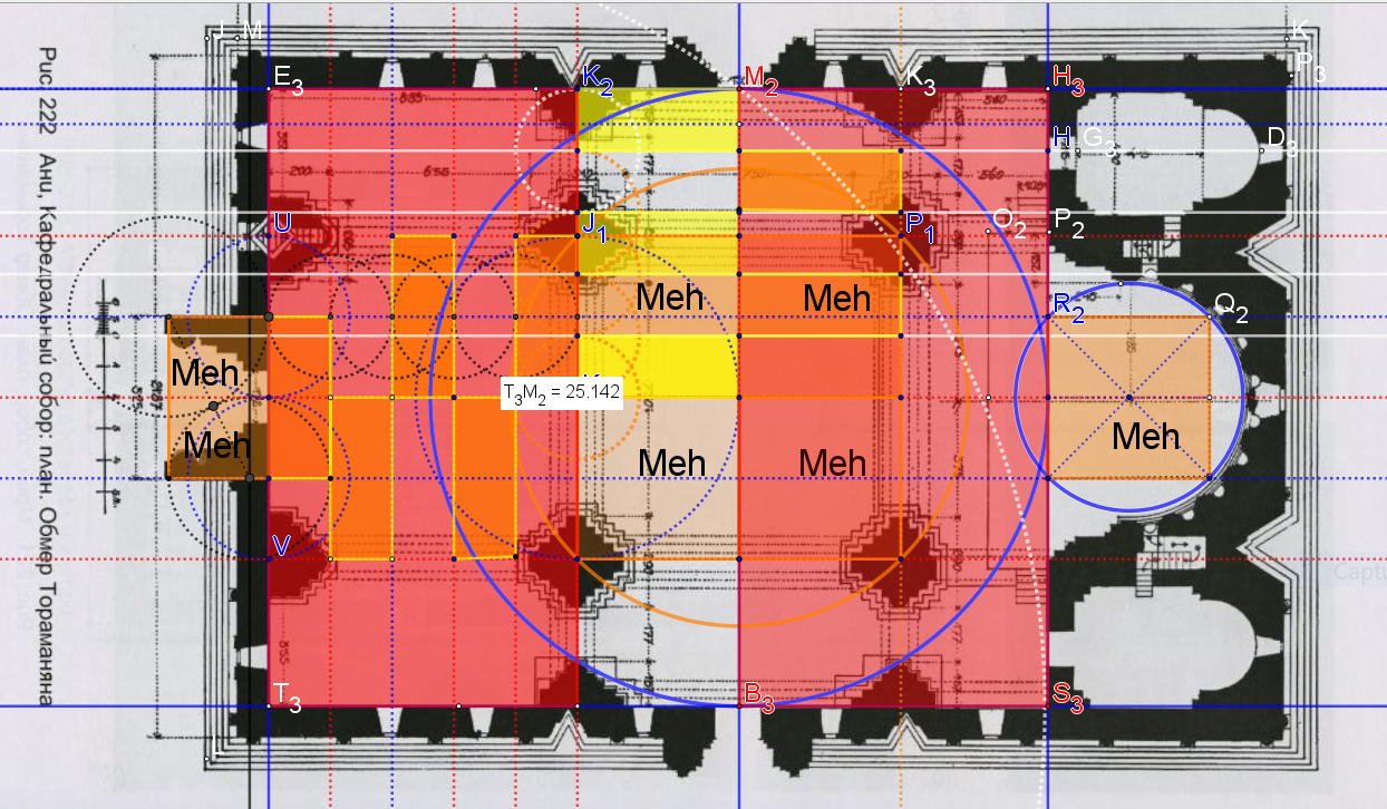 Et Tiridate pose ce même petit carré nait d'un cercle de 10 pieds romains de rayon, cercle et carré ayant même surface, aussi à l'extérieur du rectangle interne pour déterminer le cercle qui l'inscrit, cercle de l'hémicycle du choeur!