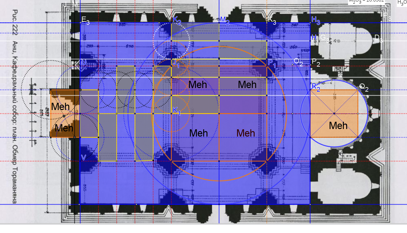 Et Tiridate pose ce même petit carré nait d'un cercle de 10 pieds romains de rayon, cercle et carré ayant même surface, aussi à l'extérieur du rectangle interne pour déterminer le cercle qui l'inscrit, cercle de l'hémicycle du choeur!