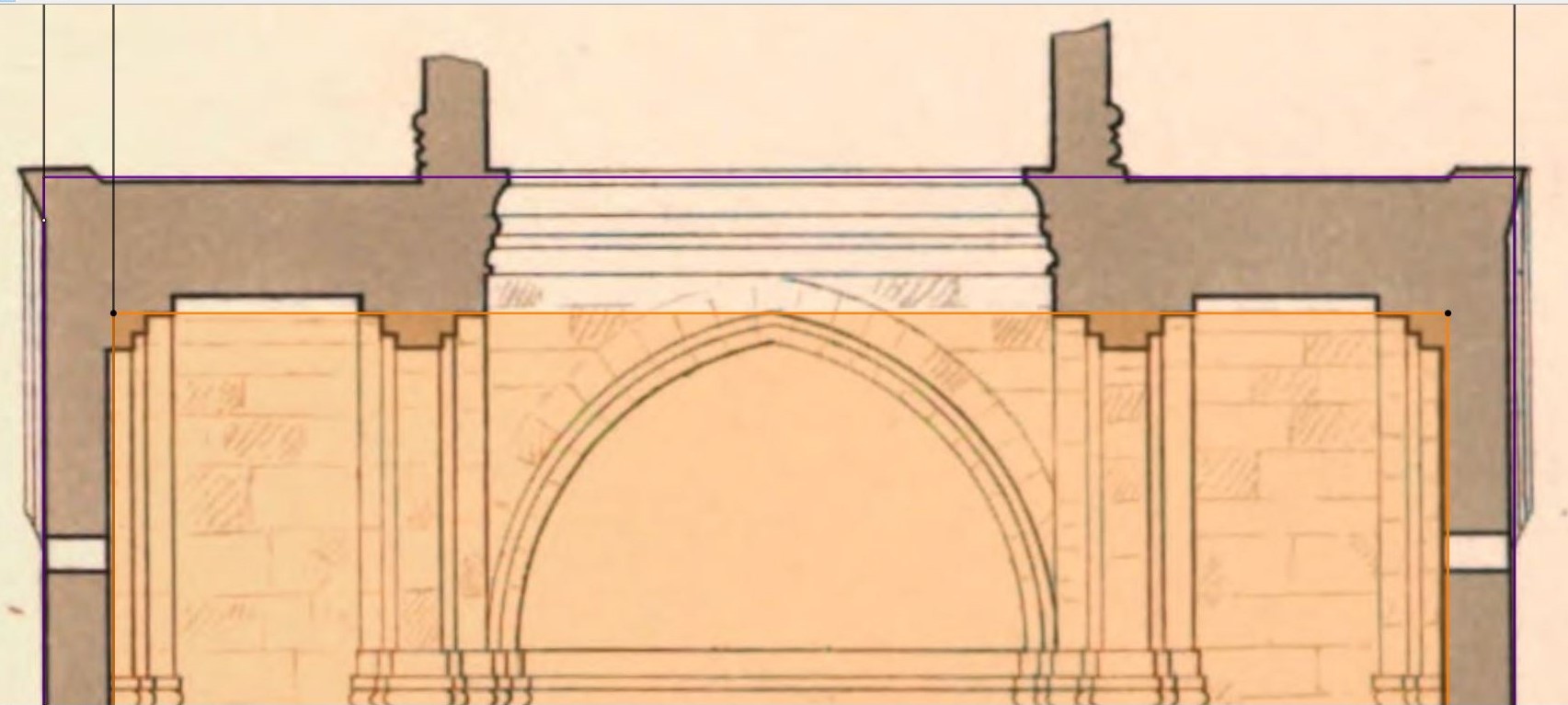 (Attention le rabattement pointillé blanc rajouté n'est qu'une valeur très rapprochée, au millième pour donner le rectangle intérieur de l'édifice)