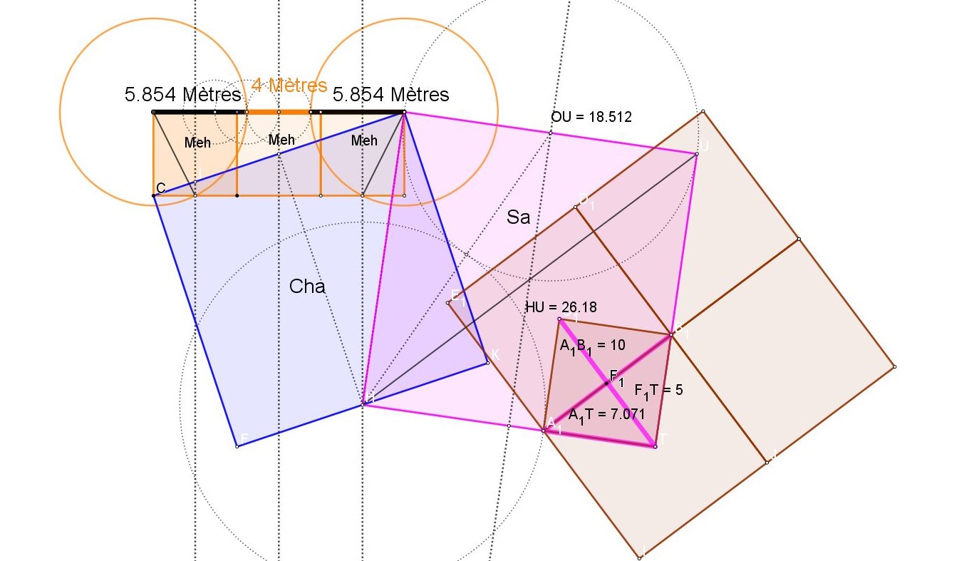 Sur le schémas ci dessus Châhâr Tâq War Pil en traits noirs, les deux carrés oranges, double carrés, ont pour surface 2 Meh, le Meh étant une mesure de surface de l'ancienne Egypte, un carré de 10 meh nessou ( coudées royales) de côté.