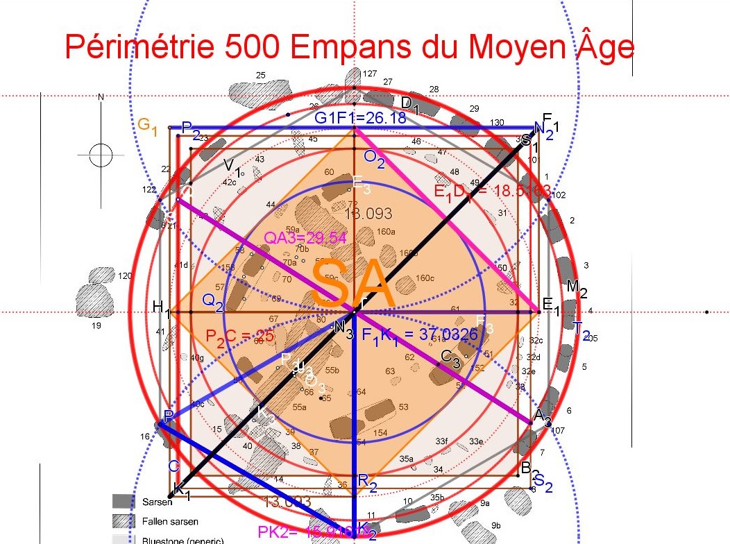 Alexander Thom est bien sympathique, mais penser qu'on va retrouver une constante en ne se fiant qu'à un travail de conception, de création, qui n'utiliserait ni les racines, diagonale du carré, double carré ( Nombre d'or et ses puissances) et triple carré, ni les quadratures périmétriques et surfaciques, donc une composition uniquement arithmétique...!?!?