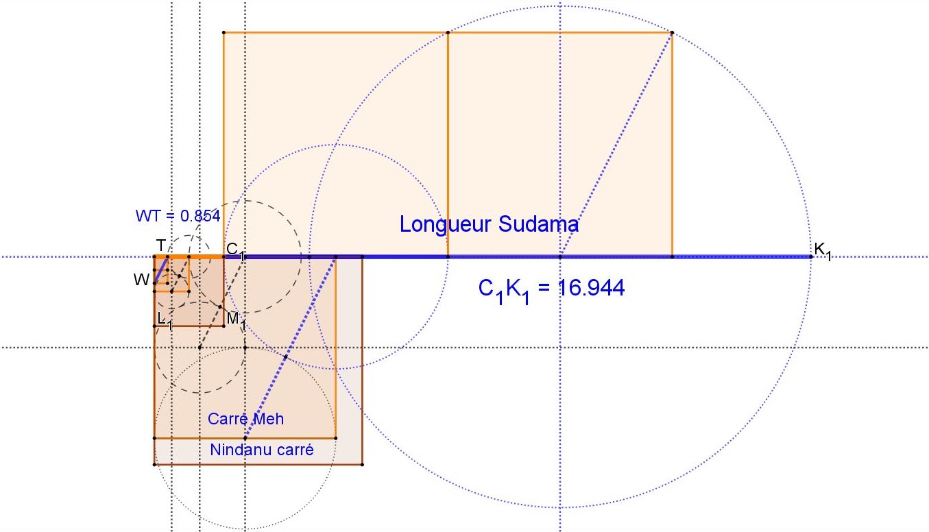 Mais c'est aussi le côté du carré Meh Egyptien, 10 meh nessou ( coudées royales) moins le rayon au sol de la rotonde de Sudama, un Gi Sumérien ou 3 Giri Sumériennes, ou Sépû Akkadiens ou 6 Kûs Sumériennes, ou 6 Ammatû Akkadiennes, ou 6 Aslû Babyloniennes.
