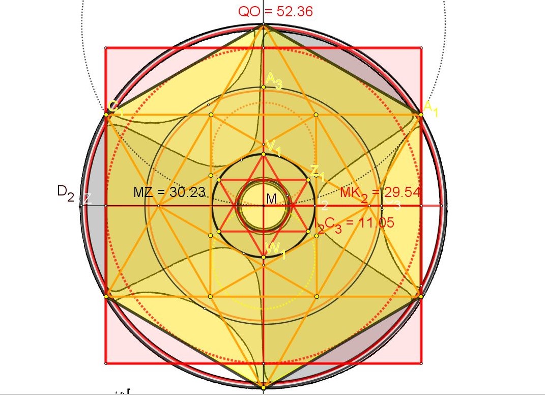 En suivant son tracé possible nous aurons pour 1 meh nessou, côté du carré premier invisible, le cercle extérieur fera donc 60.46 cm, de quoi contenter tout le monde....