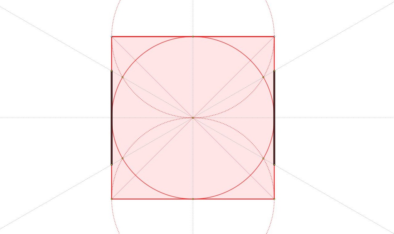 Le cercle intérieur, celui des évidements que nous avions tracé en rouge peut être tracé au compas et à la règle et ce cercle aura même surface que le carré Phi carré sur 5, équivalant d'une meh nessou Egyptienne.