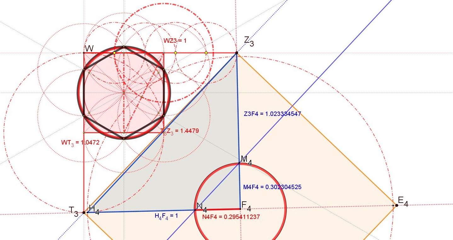 En posant le rayon du cercle noir 0.302304525 ( Phi carré sur racine de 3) sur le côté adjacent la parallèle à l'hypoténuse, grâce à Thalès, nous élira un 0.295411 au lieu de 0.295413.
