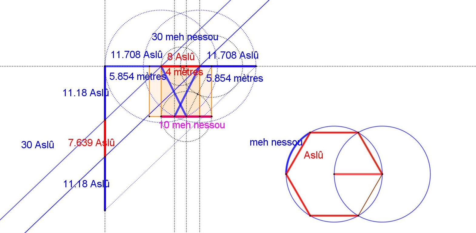 Sur le schémas ci dessus Châhâr Tâq War Pil en traits noirs, les deux carrés oranges, double carrés, ont pour surface 2 Meh, le Meh étant une mesure de surface de l'ancienne Egypte, un carré de 10 meh nessou ( coudées royales) de côté.