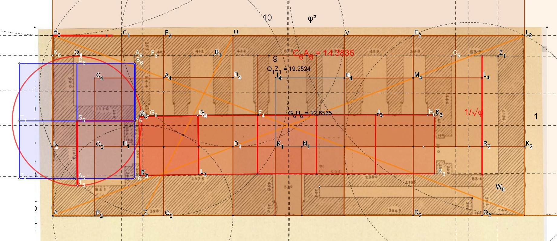 Les diagonales des doubles carrés engendrées, rayons des arcs qui mettent l'heureuse évidence que Qsar El Sagha est un rectangle de proportion 1 et Phi carré.