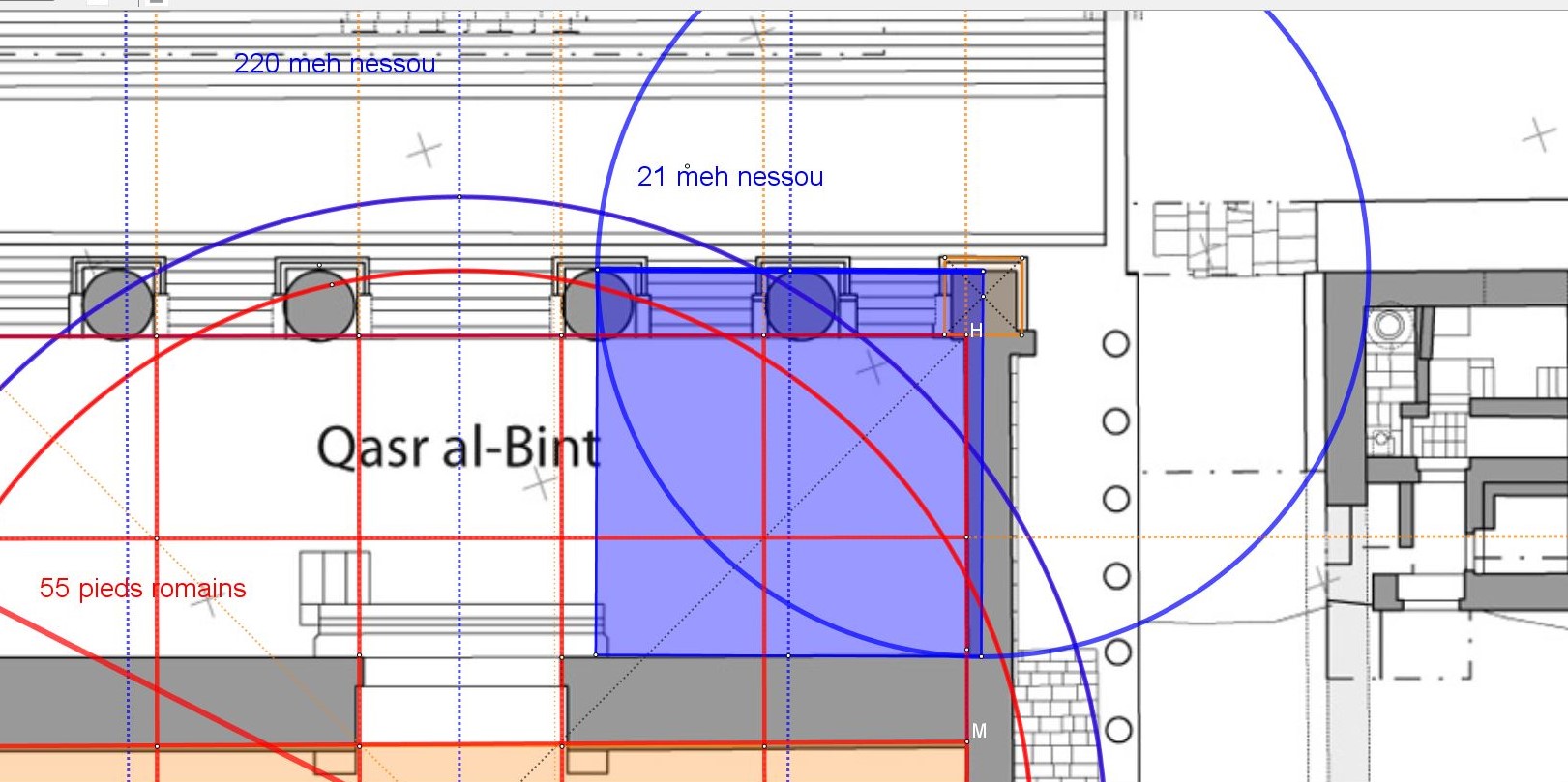 Nous reviendrons avec une explication plus complète plus tard, mais on peut déjà dire qu'un carré prend naissance par les axes des colonnes qui fait lui 100 meh remen de côté, ce qui montre la connaissance parfaite du maitre d'oeuvre des gestes des scribes des formes et des contours Egyptiens.