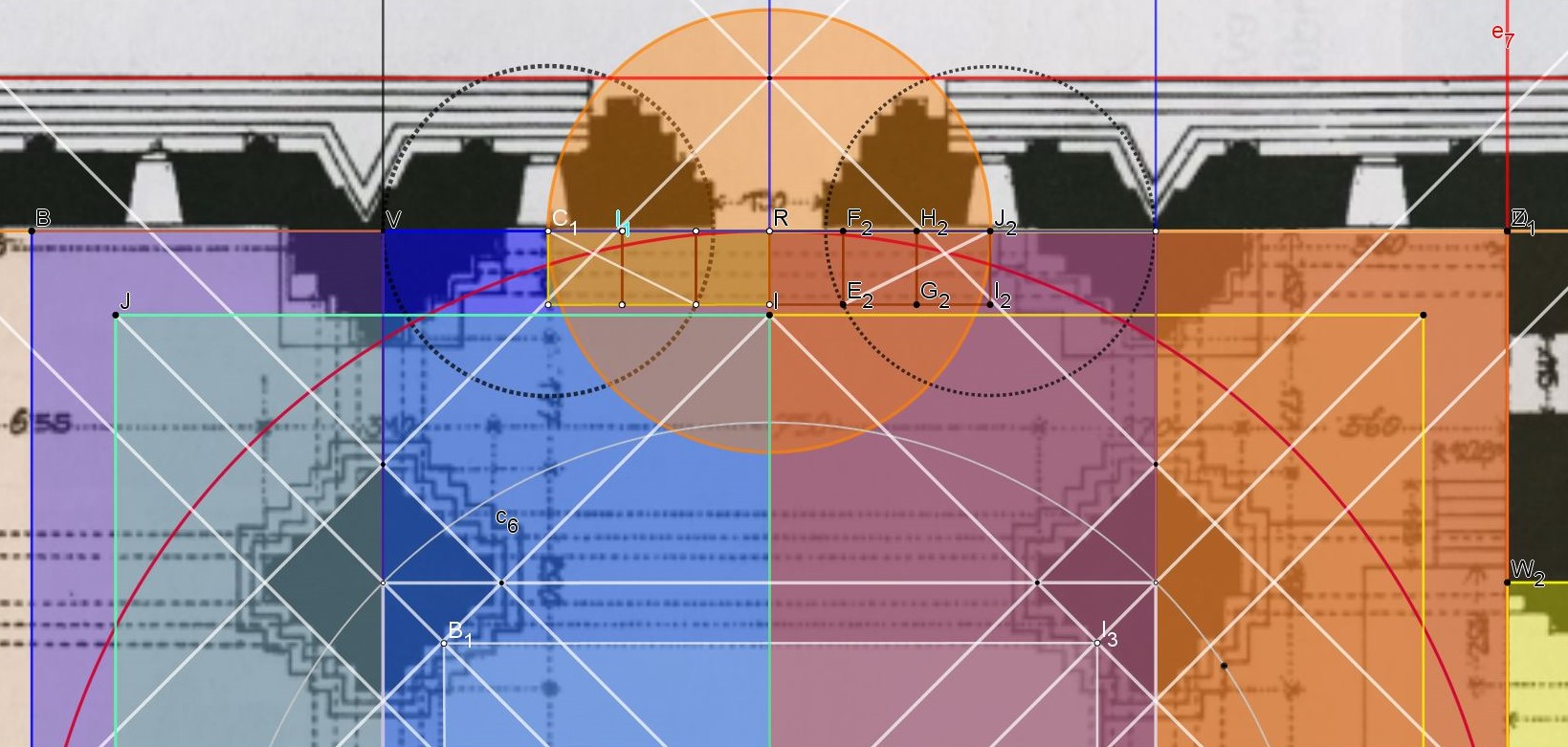 (Attention le rabattement pointillé blanc rajouté n'est qu'une valeur très rapprochée, au millième pour donner le rectangle intérieur de l'édifice)