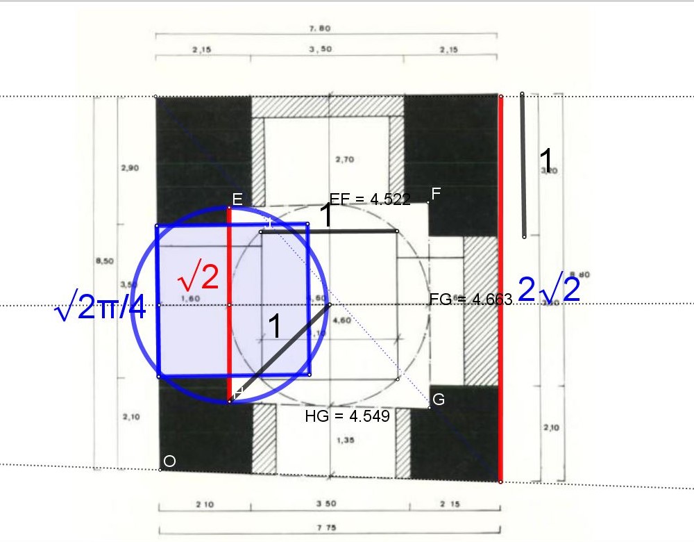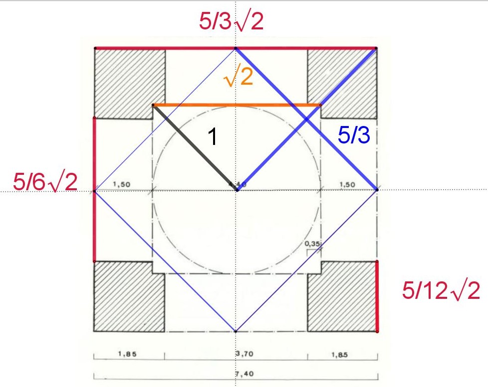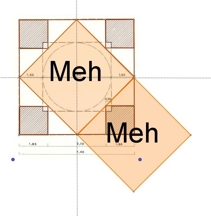 Et le carré du Chahar Taq fait bien la même surface, 2 Meh que le double carré, soit un carré de 7.40 mètres de côté !
