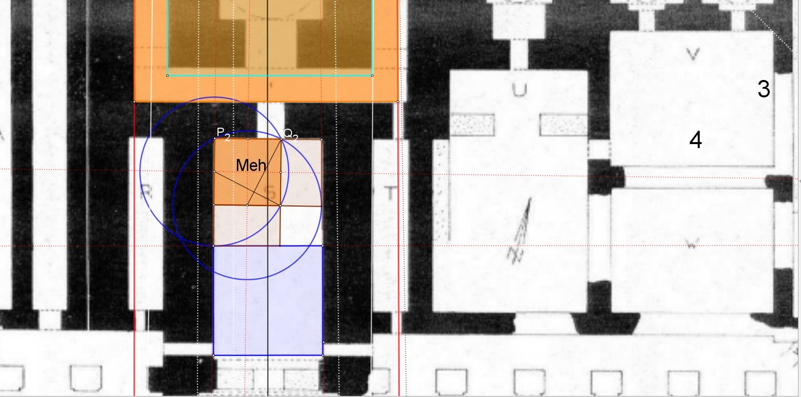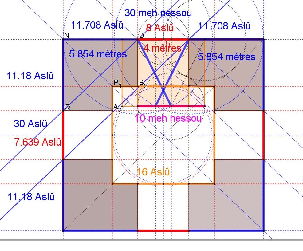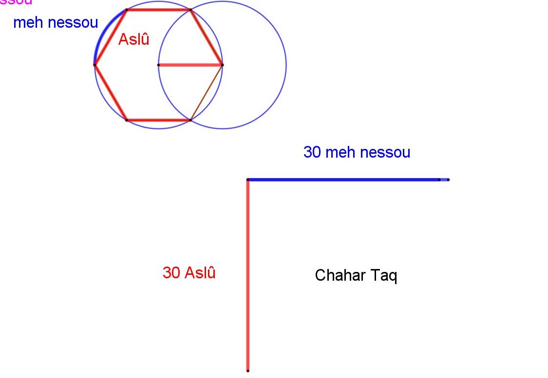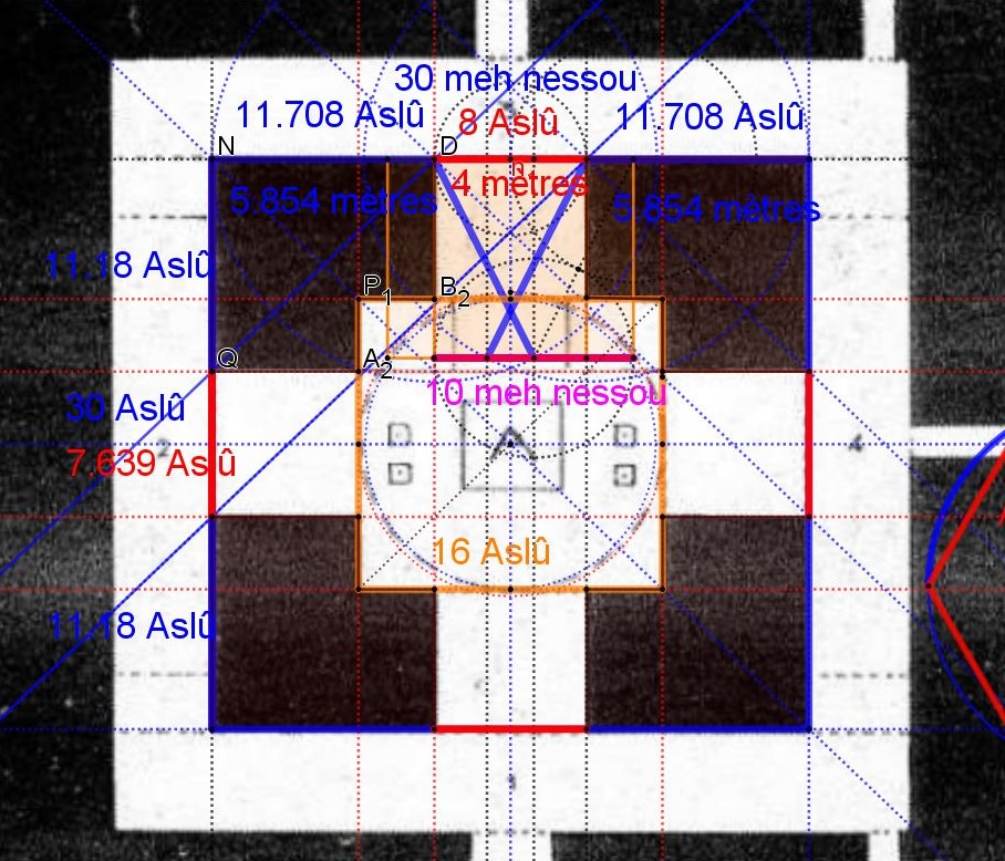Sur le schémas ci dessus Châhâr Tâq War Pil en traits noirs, les deux carrés oranges, double carrés, ont pour surface 2 Meh, le Meh étant une mesure de surface de l'ancienne Egypte, un carré de 10 meh nessou ( coudées royales) de côté.