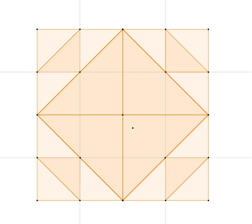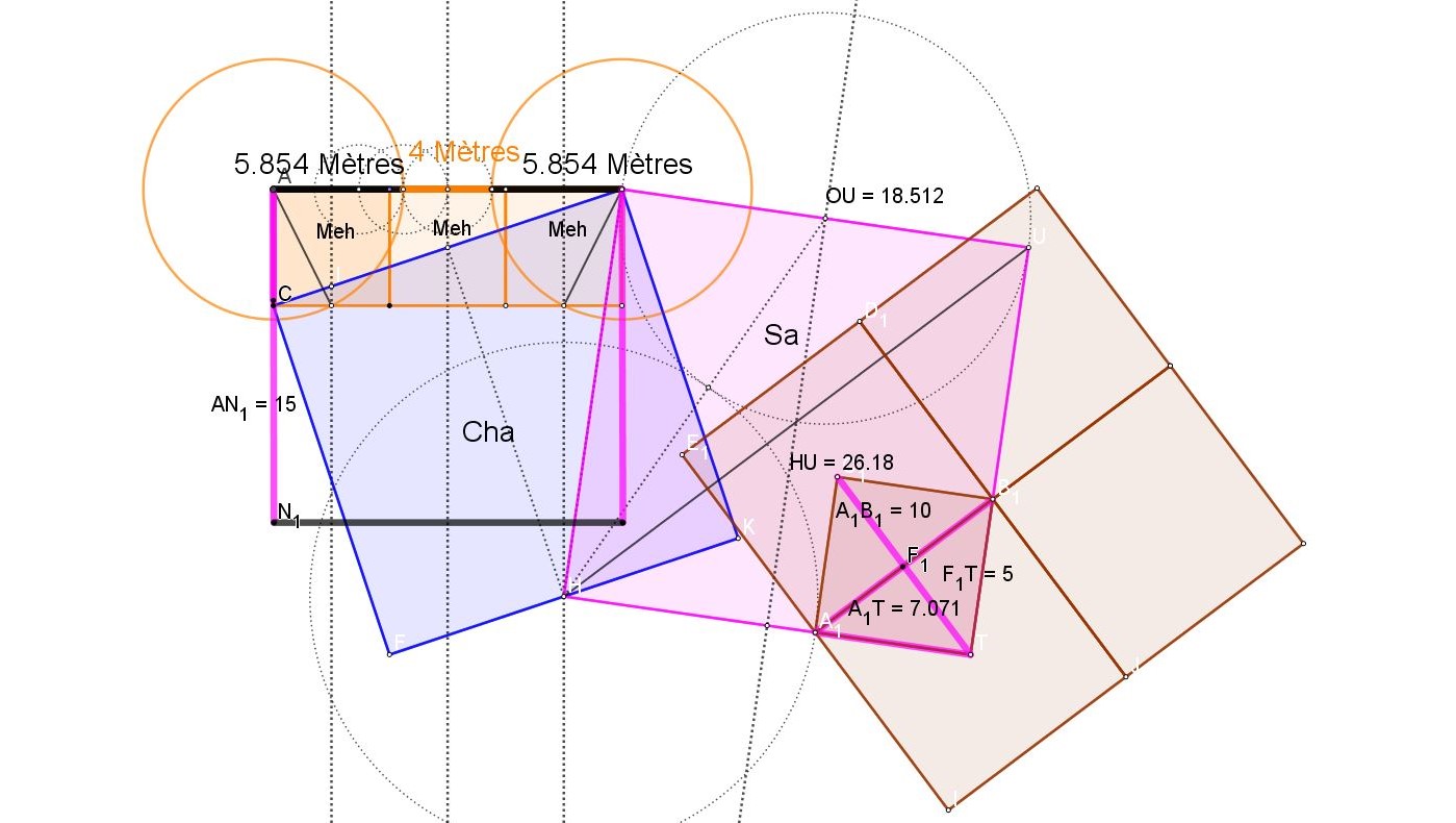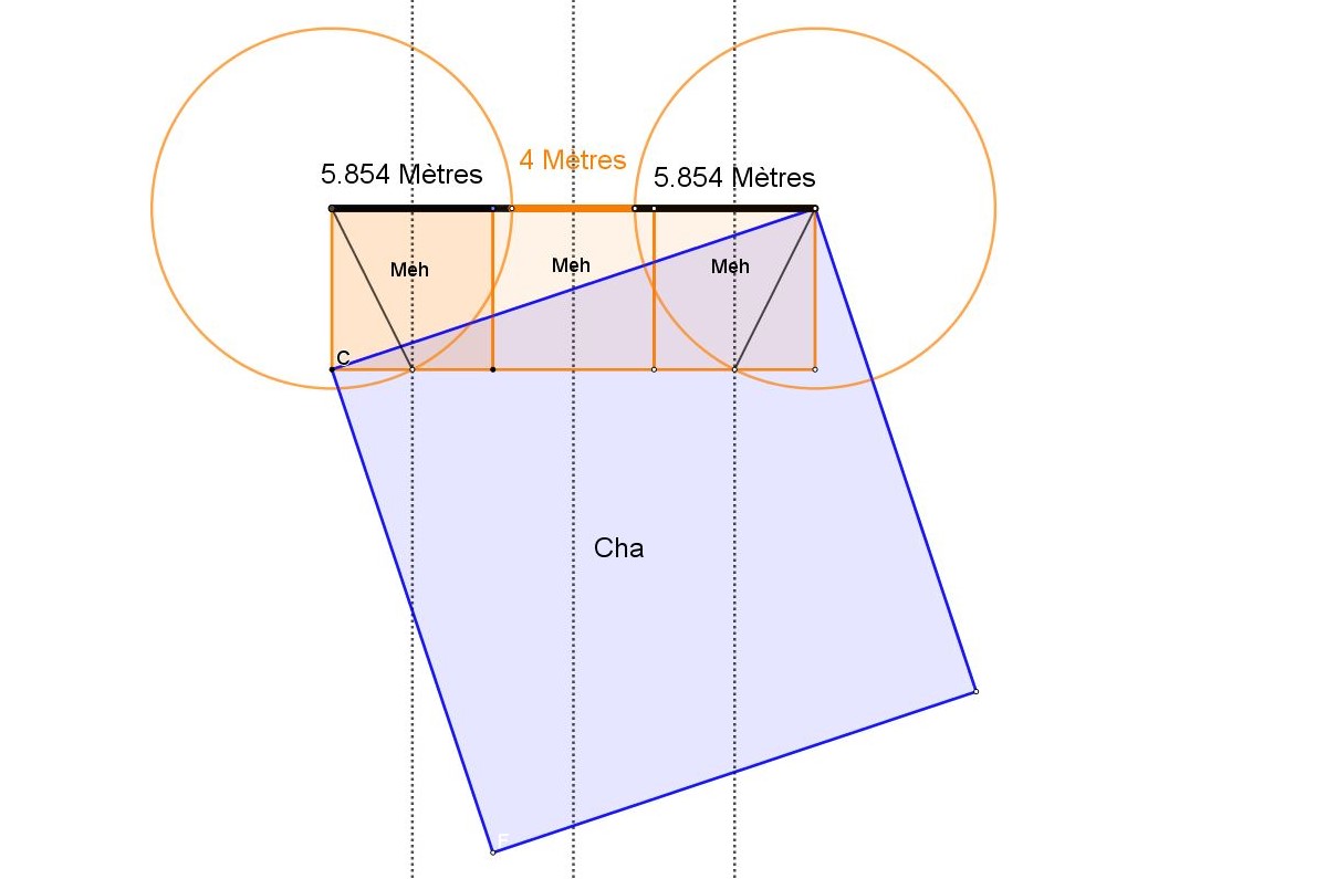 Sur le schémas ci dessus Châhâr Tâq War Pil en traits noirs, les deux carrés oranges, double carrés, ont pour surface 2 Meh, le Meh étant une mesure de surface de l'ancienne Egypte, un carré de 10 meh nessou ( coudées royales) de côté.
