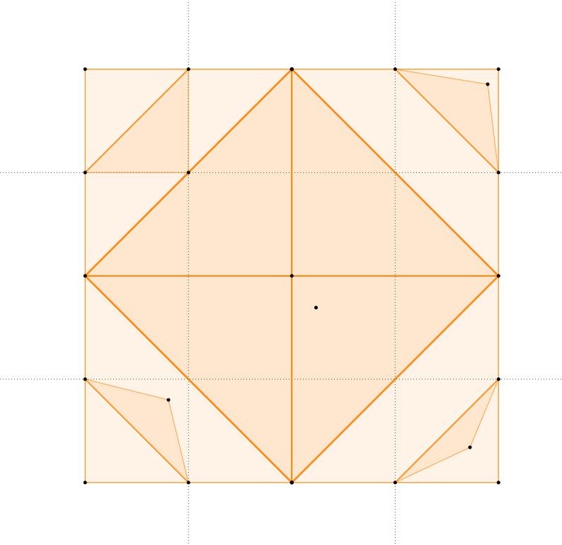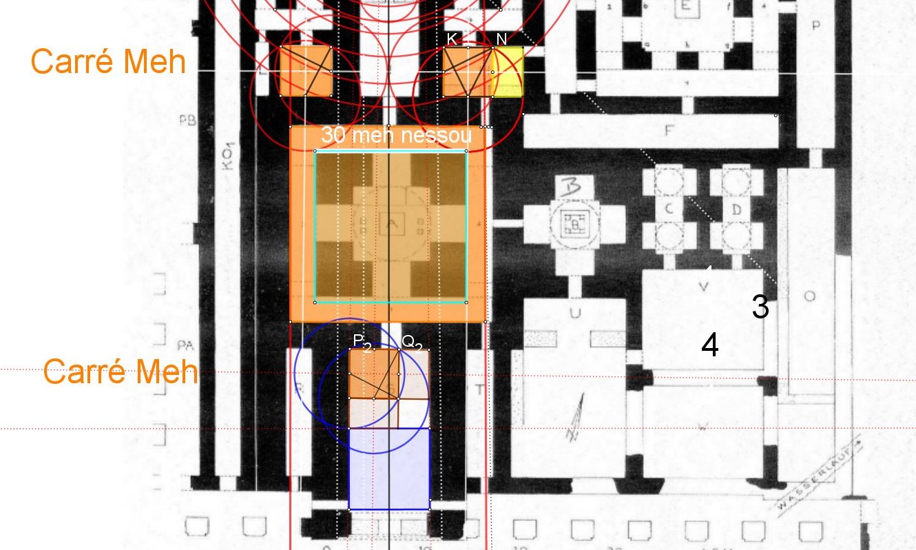 Sur le schémas ci dessus Châhâr Tâq War Pil en traits noirs, les deux carrés oranges, double carrés, ont pour surface 2 Meh, le Meh étant une mesure de surface de l'ancienne Egypte, un carré de 10 meh nessou ( coudées royales) de côté.