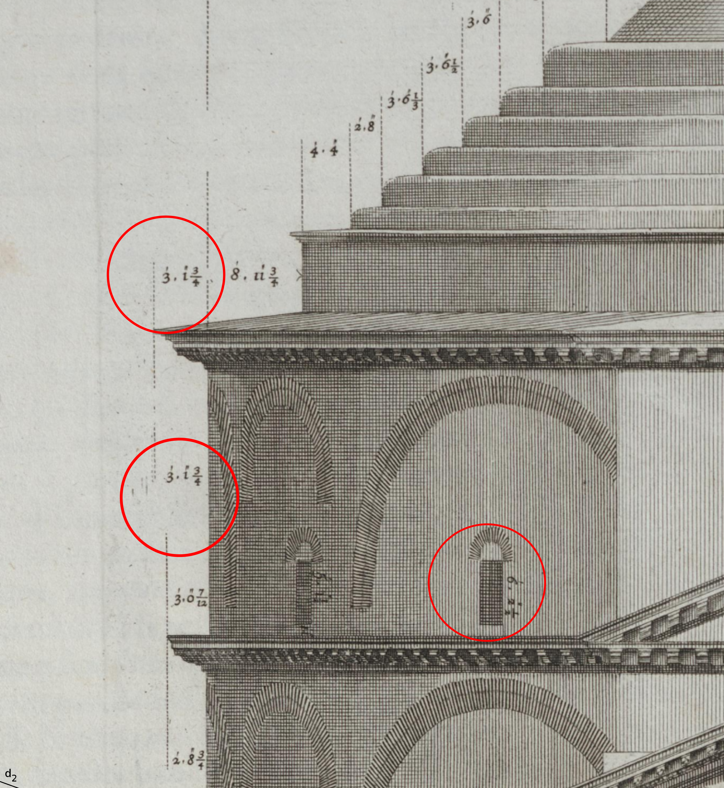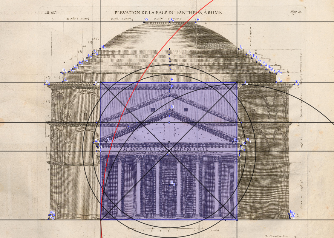 NB Sur le plan par rapport au paramétrage à 44.08 m pour le dôme, j'ai un 31.6 m et si la vraie valeur du dôme était plus 44 m que 44.08 m, il y en a 9 différentes, on tomberait sur 31.54 à plus ou moins 10 centimètres, on ne peut pas mieux avec un dessin...et qu'elle était la valeur du pied du roi pour Desgodetz, car cela se disputait encore à l'époque...