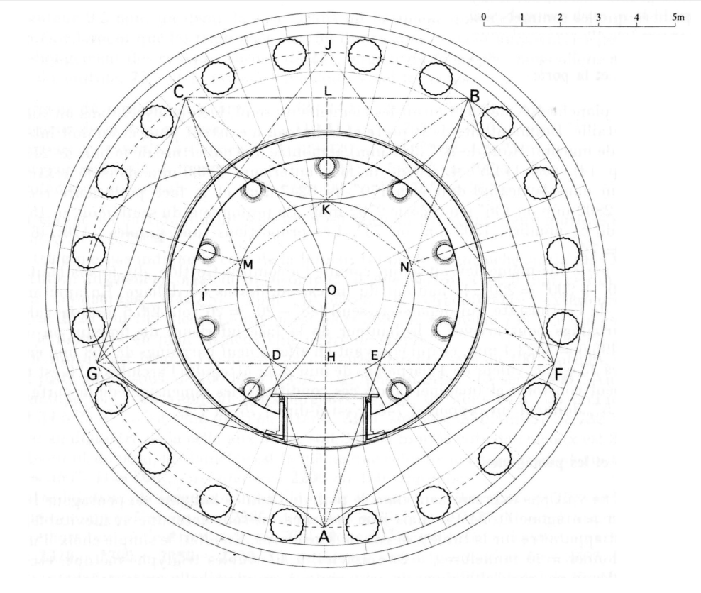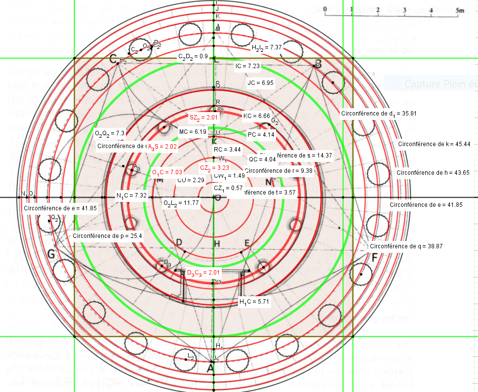 Ce carré de quatre meh surface est en quadrature périmétrique avec la troisième marche, cercle de 6.66 mètres de rayon, socle qui reçoit les 20 colonnes !