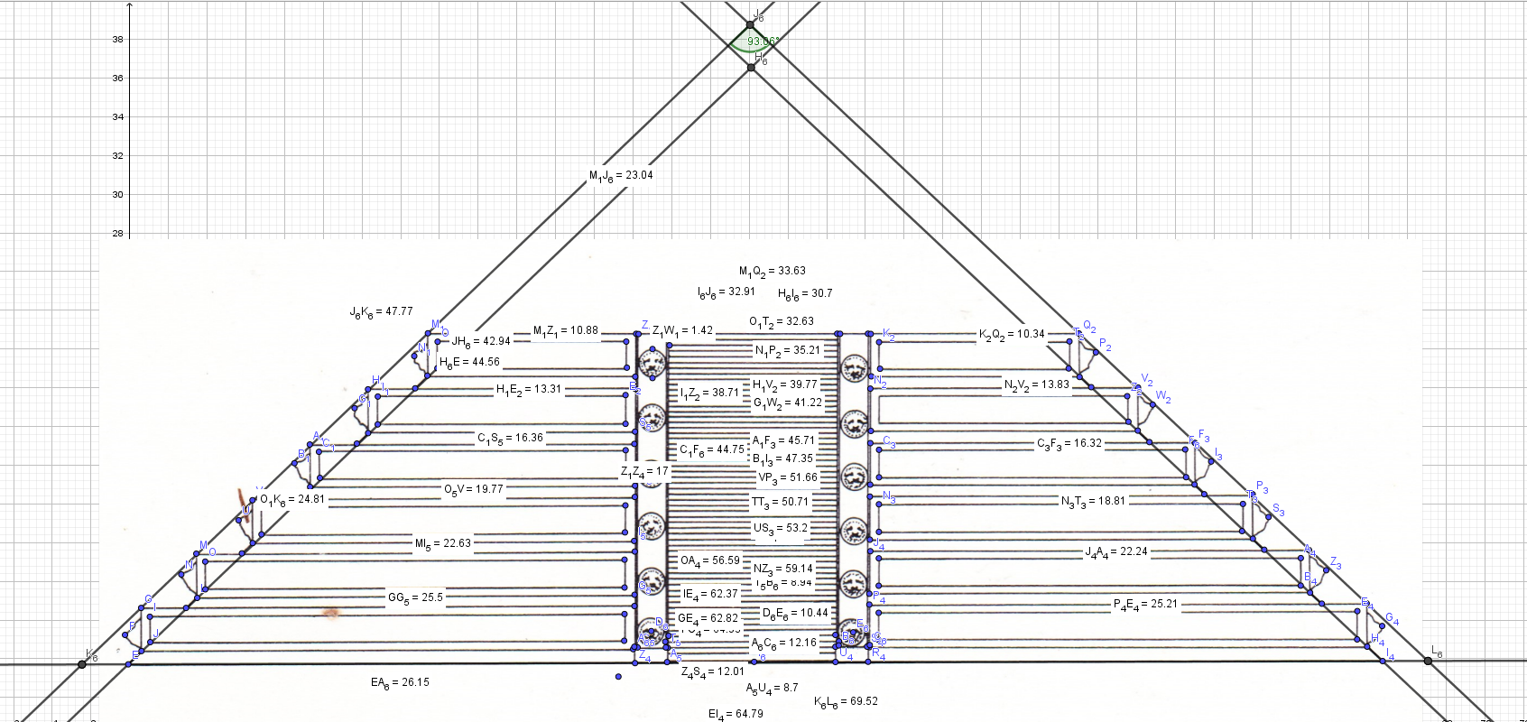 Entre la largeur de la base et celle de la terrasse, le rapport est une quadrature surface, entre le côté du carré et le rayon du cercle de même aires soit racine de Pi, nous pourrions former alors un rectangle tel le quatrième sanctuaire du tombeau de Toutankhamon.