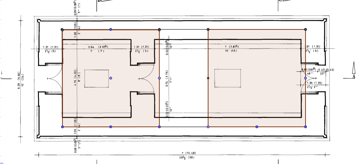 D'autre part la quadrature de la chambre gauche indiquée par la hauteur de la seconde porte (bravo de l'avoir débusquée, c'est magnifique) ne semble pas dépendre de la longueur totale de notre petite chapelle rouge.