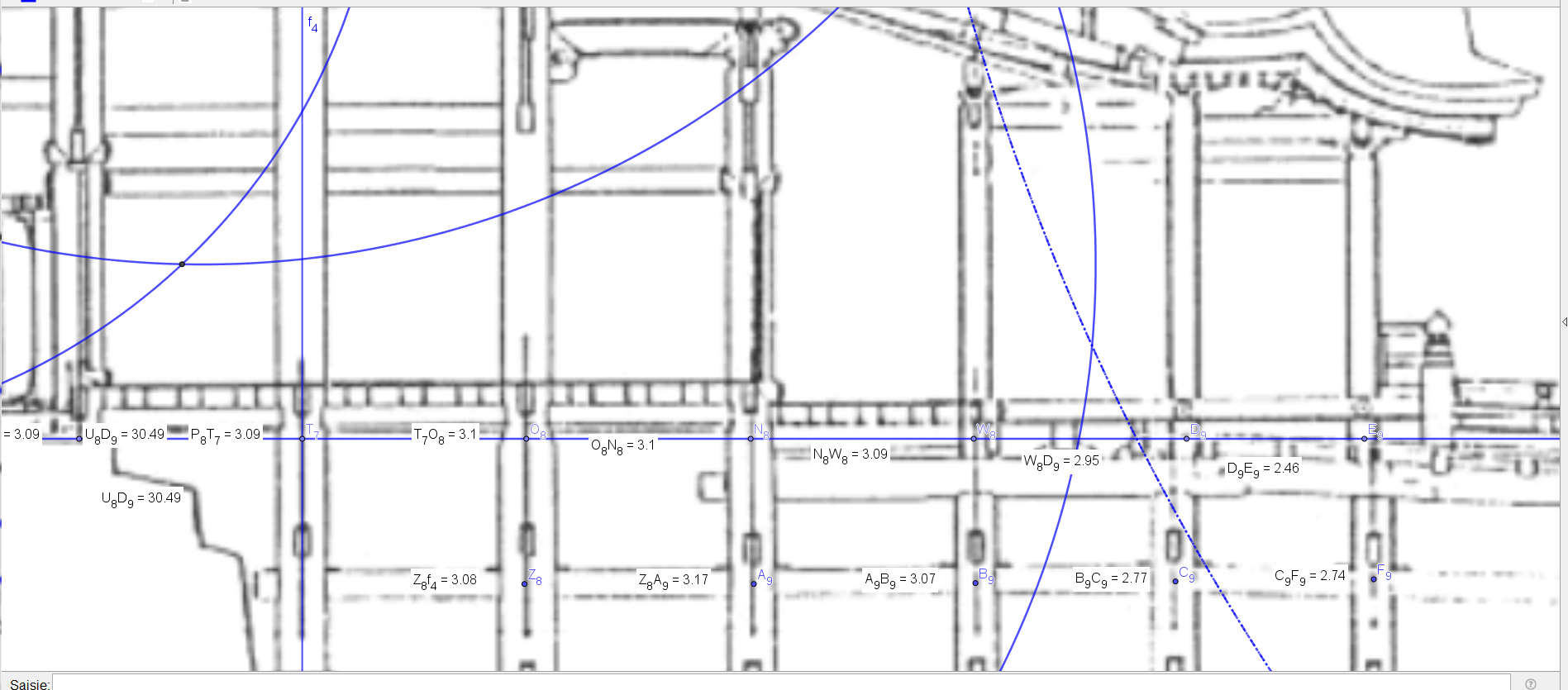 Les espaces entre les piliers sont peut être de 10 Shaku, mais il y a les portes centrales qui à chaque fois permettent le basculement de l'arithmétique à la géométrie par la quantité rajoutée...comme une suite déterminant des rapports, racine de 2, racine de Pi sur racine de 2, Phi, racine de Pi, Phi fois racine de 2 et Pi, tout cela dans l'écartement de 2( en partant de deux piliers écartés de 10 Shaku), 4, 6, 8, 10 piliers, bien évidemment avec la porte centrale majorée atteignant 3.52 m!