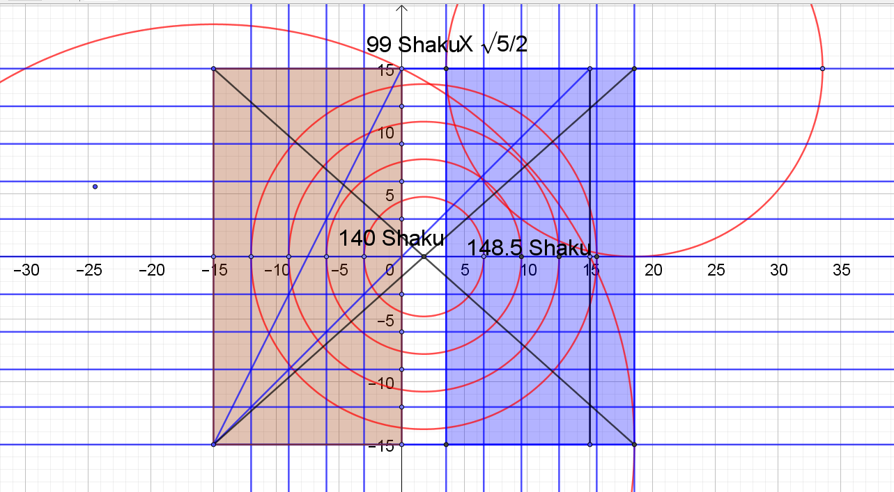 Le choix du 99 donne bien évidemment 140 Shaku à la diagonale du carré de 99 de côté, c'est la triangulation rationnelle du carré des arpenteurs!.