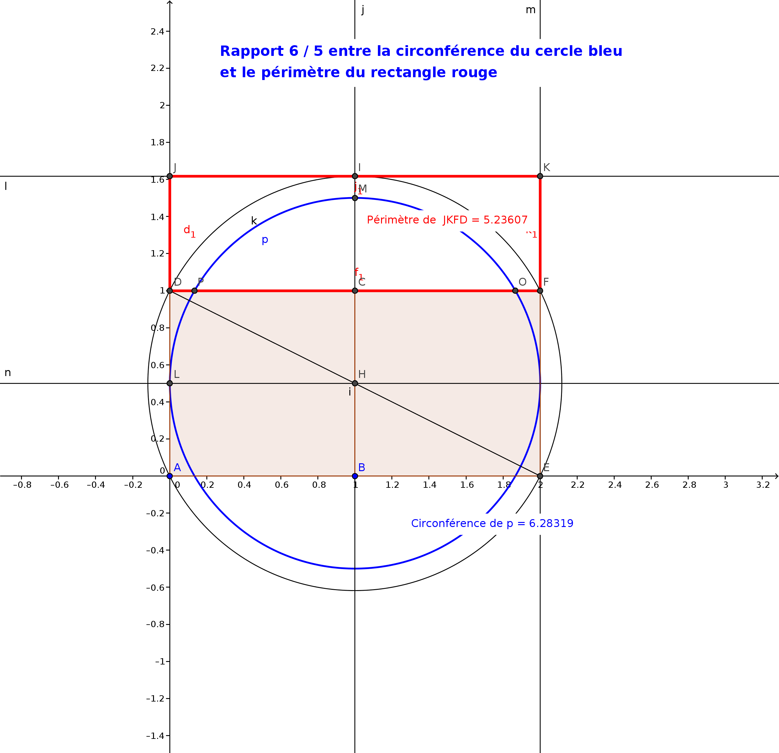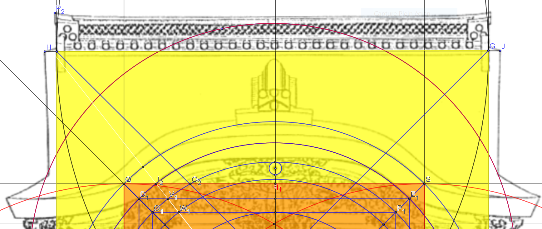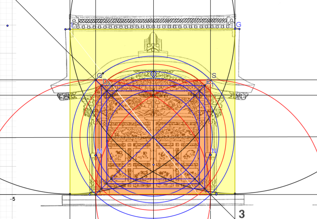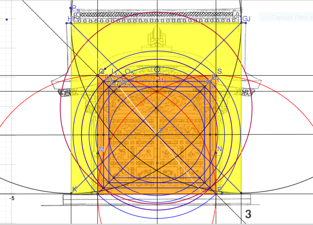 Prenons du recul, nous voyons bien un autre carré formé par les axes des deux piliers, ne seraient-il pas les 6/5 de la largeur!