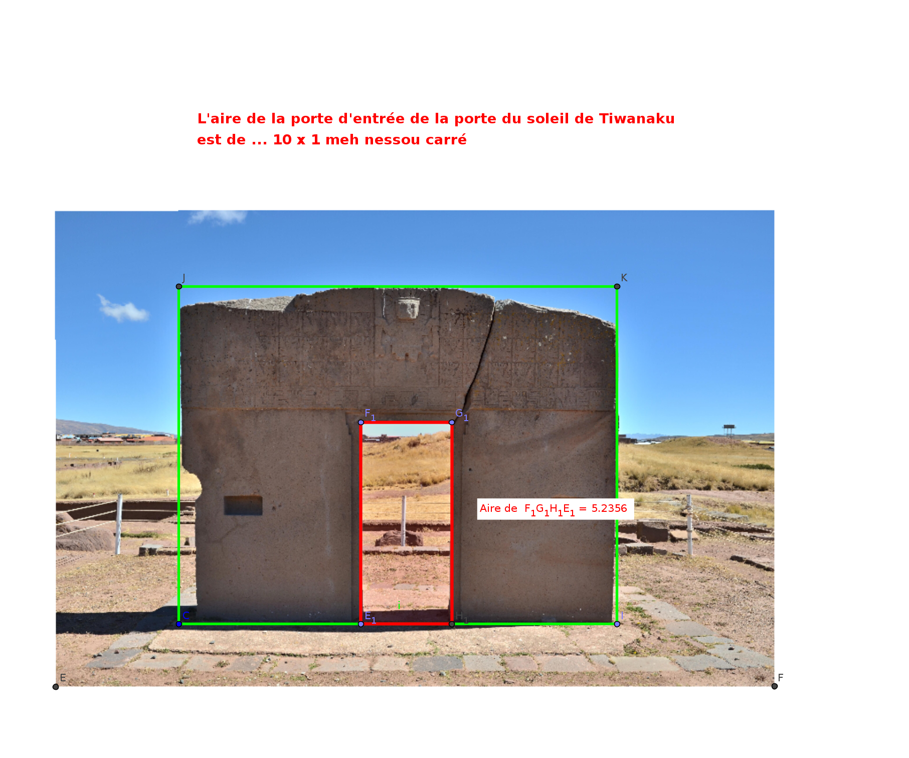 Je voulais ajouter que l'aire de la porte d'entrée de la Porte du soleil de Tiwanaku mesure 5.236 meh nessou carré, et cela n'est pas le plus dingue comme je vais montrer après ...