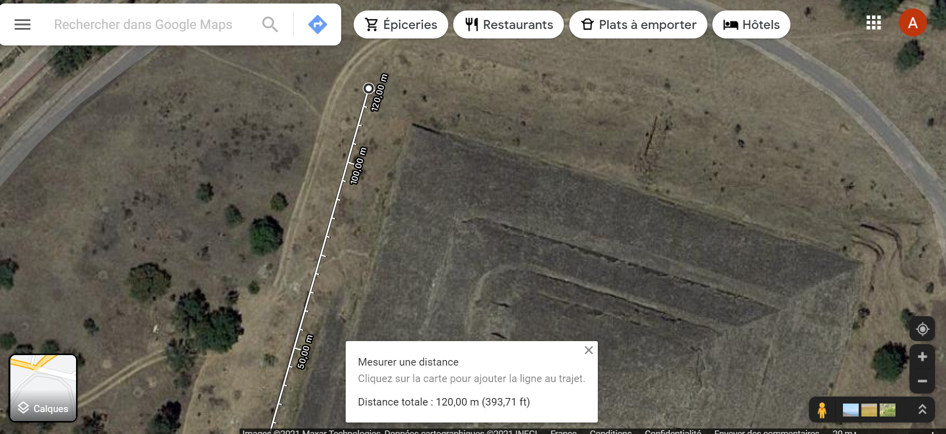 Prenons maintenant la distance entre la plateforme de 20x20 m sur la place de la lune et celle d'aussi 20x20 m sur la place de Quetzalcoatl.