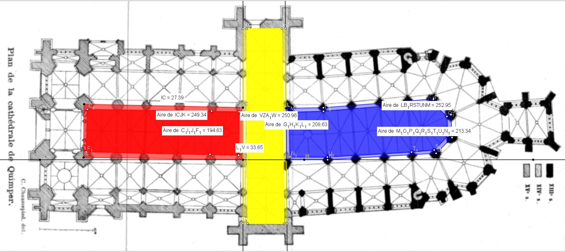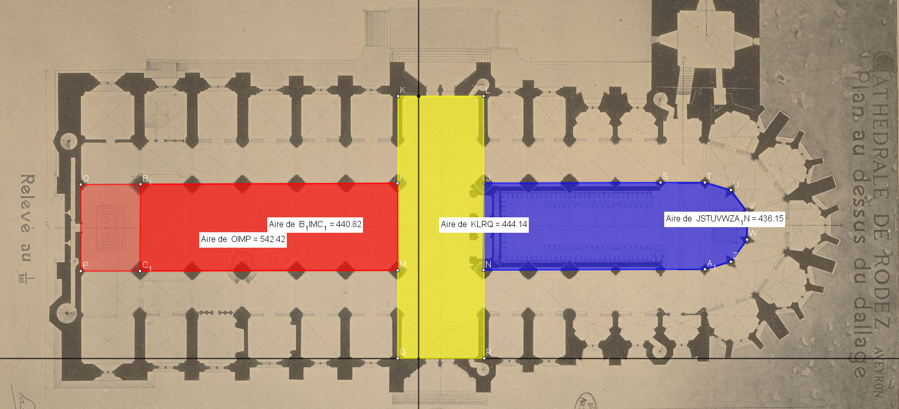 Son tracé est simple puisque 60 pieds Romains fois la racine de 5 nous donne ce côté du carré de 5 Clima de surface correspondant à la somme des surfaces du Chœur, Transept et Nef- Narthex...