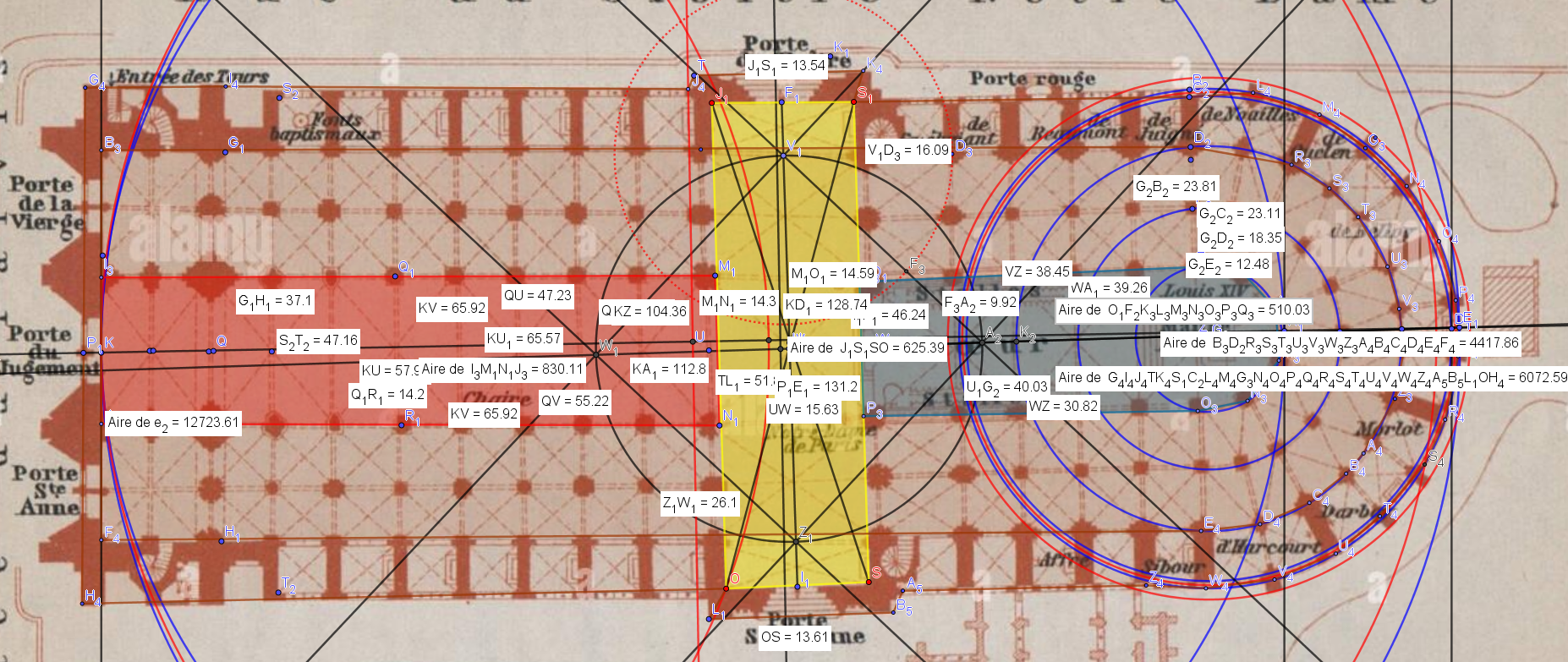 Et de sacrées surprises en cherchant le carré surface correspondant à la somme Nef-Transept-Choeur, mais aussi le cercle de même surface et de même périmétrie, mais encore le carré et le cercle de même surface et de même périmétrie de chaque partie de cette Trinité.