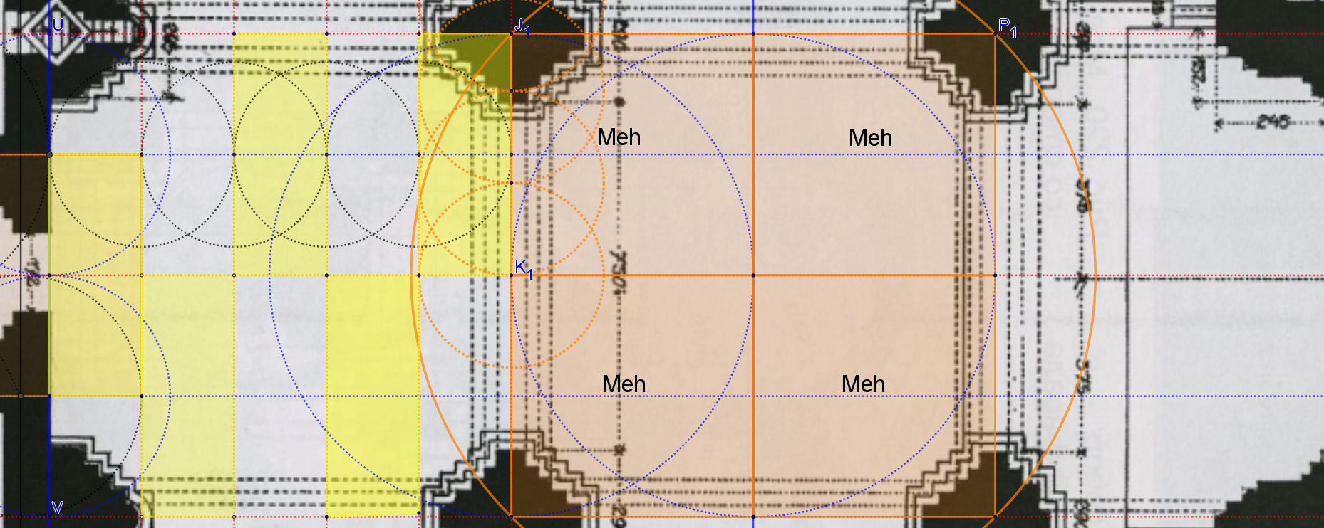 En bleu, le grand cercle determine donc la largeur de l'édifice, il a pour diamètre la distance donnée par 20 modules surface !
