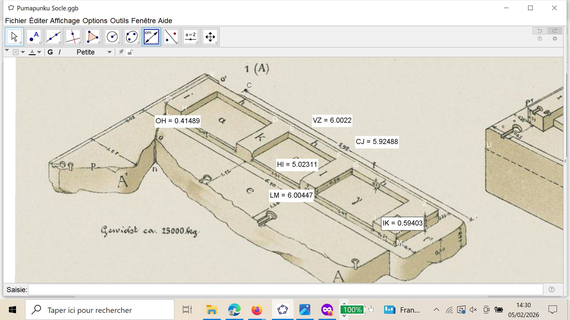 Paramétré sur Geogebra, j'ai pris la mesure en haut à droite de 5.92 mètres et paramétré dans l'étiquette pour pouvoir être vérifié.