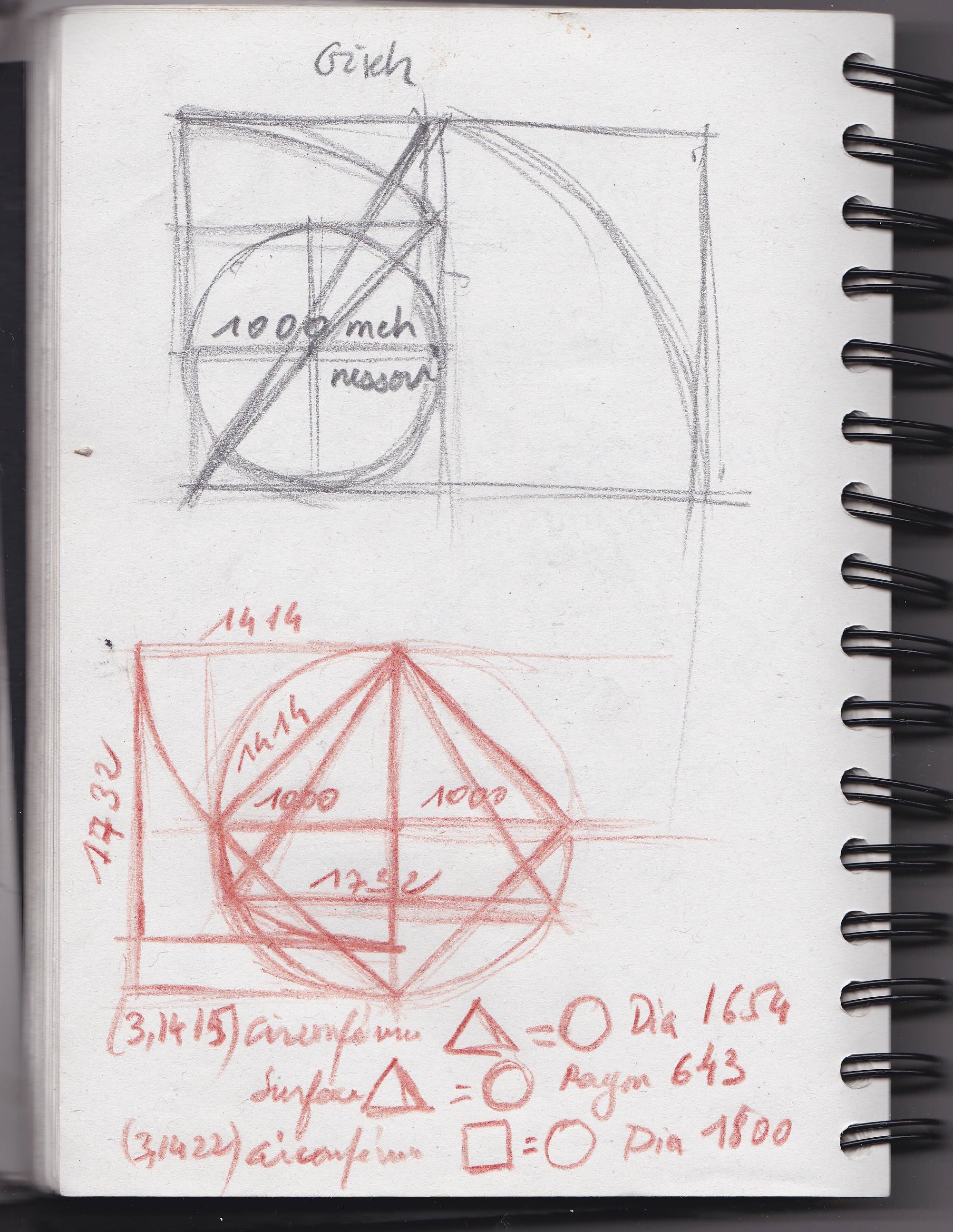 Si nous considérons le périmètre du rectangle 1732/1414, il est presque égale à la circonférence du cercle de 1000 meh nessou de rayon, plus exactement un rayon de 1001 meh nessou.
