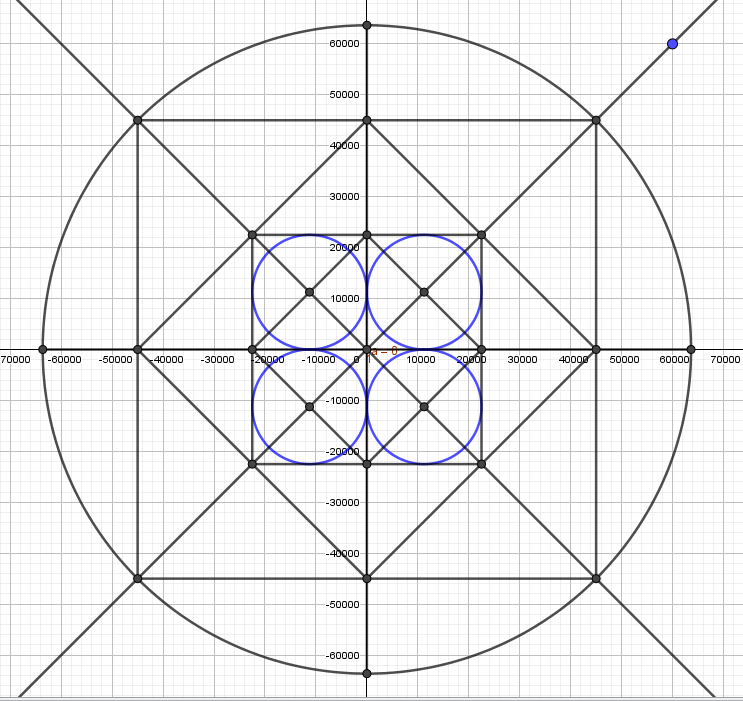 Ces carrés ont même surface que le cercle des tours qu'ils font naître, cercles rouges!