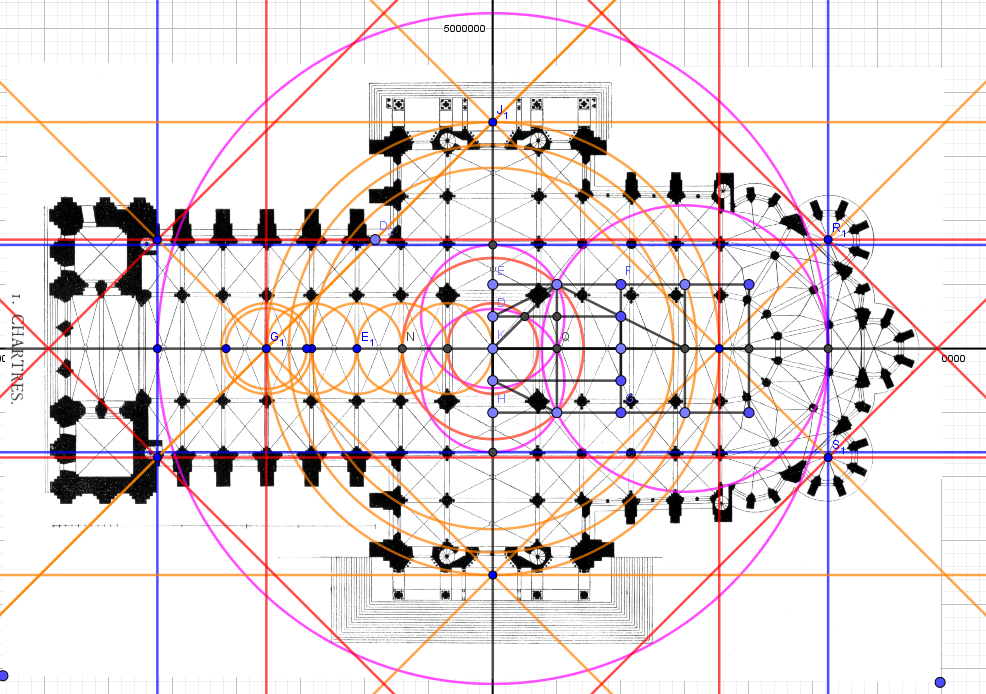 Avant de joindre un plan de Chartres avec les mesures de John James, ce qui permettra de réunir le tracé géométrique et les calculs de GeoGebra avec la réalité, car le plan sous ce tracé orthonormé décale malheureusement très légèrement( Tous les plans qu'on trouve, sont imparfaits), des défauts que les vraies mesures de Chartres n'ont pas, la précision des bâtisseurs étant remarquable, nous allons donc commencer quelques tentatives sur l'élévation...